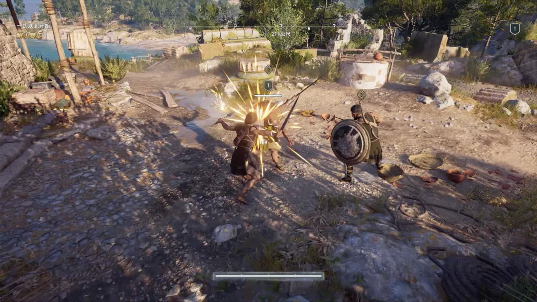 三是战斗的部分,继承了《起源》的格斗式玩法,要知道进攻、防御、破防后再攻击,不能瞎打。随着后续游戏的展开,你会发现使用长矛和使用其他类型武器攻击方式、效果有所不同,这都是继承《起源》的。这一代里也能通过技能树的加点获得一些新的攻防技能,有所不同的是,这些技能可以通过快捷键设置在屏幕的快捷栏里,最多可以放4个,对应手柄的4个按键。