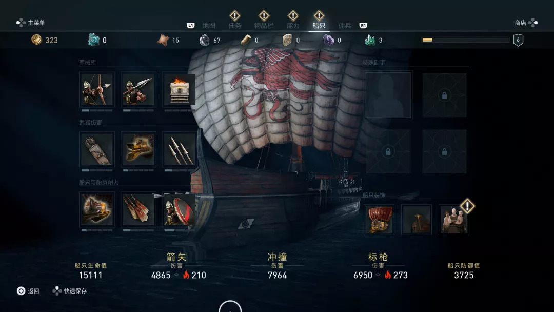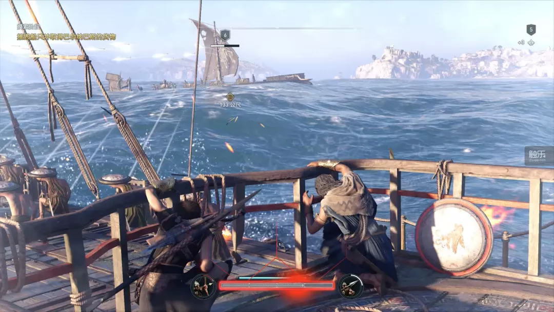 这个部分怎么说呢,如果你玩过《黑旗》,也玩过《起源》的海战部分,其实完全不难上手,基本上都是一个套路,如何攻击、如何防御、怎么切换武器等等,都与前作差别不大。值得说的是海战系统的深入程度,如果《起源》里的海战只是随便打打,像是一个基本版,那么《黑旗》里的海战因为有接舷战和升级,会显得稍微复杂一些。到了《奥德赛》,海战可能会变得更复杂,在战船的属性界面,我们看到了很多升级元素,从船员到武器、耐久度等,有很多属性能够升级。
