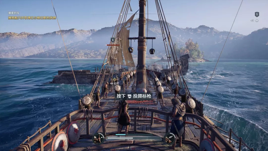 游戏里的第一次海战过后,有个任务会让你给船只招募一个副手。招募的时候首先需要让伊卡洛斯——你的老鹰——在空中俯瞰整片区域,查看每个敌人隐藏的属性,找到那个最合适的人,这样招募而来的目标才会更适合你的船——当然,要招募一个人,你必须用斯巴达踢击击败他。