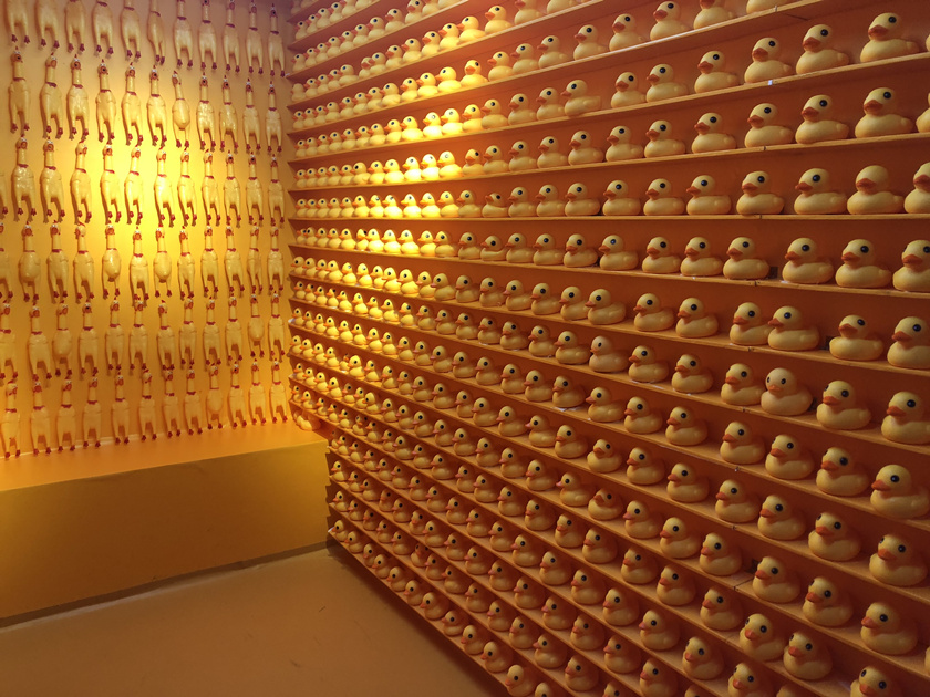 那是一个看起来很“解气”的展览:推开大门,首先看到的是一个挤满了惨叫鸡和小黄鸭的隔间,铺在该隔间地面上的则是常常出现在各大综艺节目中的“伤人”利器,比如指压板。