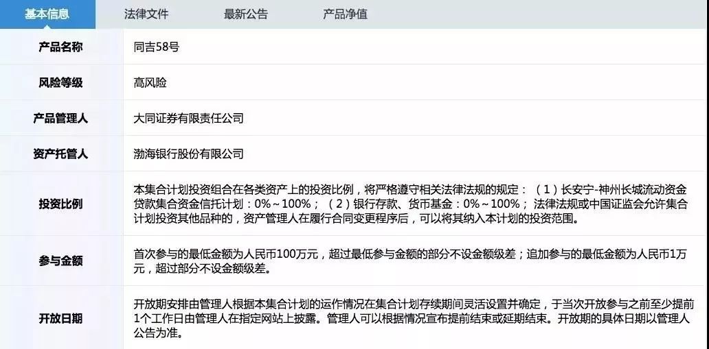 根据产品介绍,大同证券“同吉58号”资管计划产品为高风险产品,成立于2017年8月24日,运作期为1年,产品管理人为大同证券,资产托管人为渤海银行。该产品底层资产为通过集合资金信托计划投资于神州长城发放信托贷款,用于补充流动资金。其起投金额为人民币100万元,利率6.8%,资金规模6000万元。
