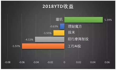 除了美国之外,中国的不少机构也在涉足人工智能投资顾问业务,比如招商银行的摩羯智投、工商银行的 AI 投、宜信投米 RA、理财魔法、璇玑等。根据《轻金融》统计,只有璇玑的投资收益是正的,其他四家的智能投顾都是负数。但是对比沪深 300 指数同期 10% 跌幅的话,剩下的四家表现其实也不算差。
