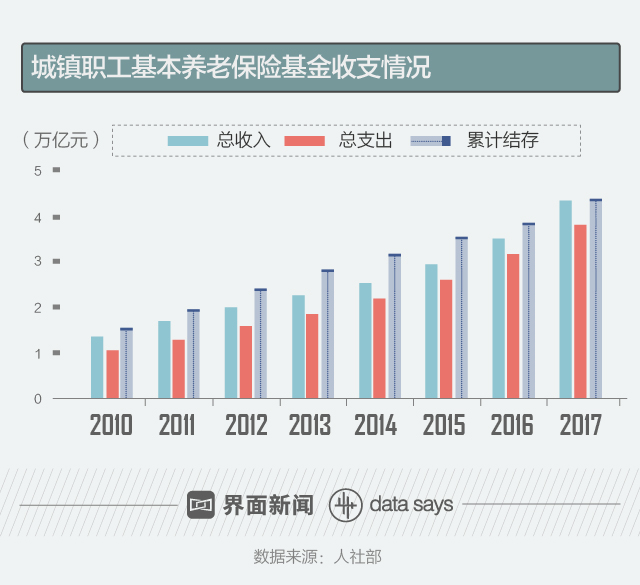 界面数据(公众号ID:tuli_shuju)查阅人社部数据发现,城镇职工基本养老保险基金(下称养老金)的收入和支出都在近年快速上涨,2017年累计结存近4.4万亿元。