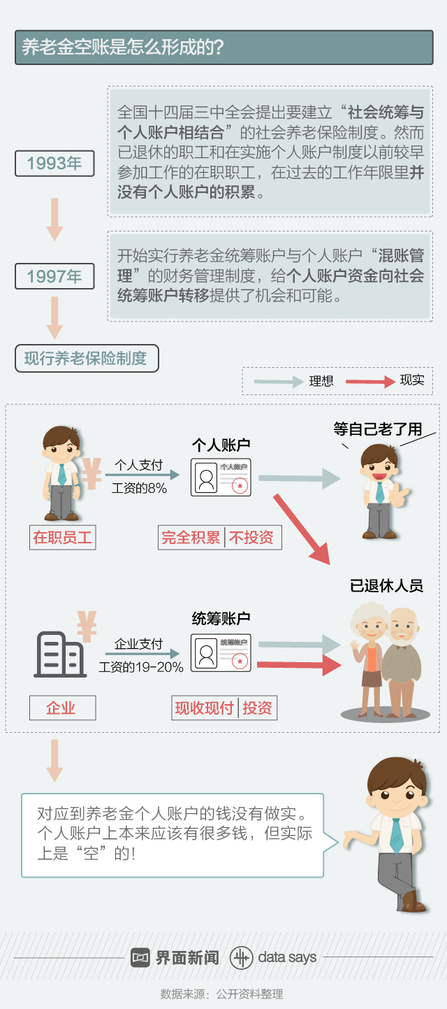 按照现行养老保险制度,在职职工每月给自己缴纳的养老金,实际上并未进入自己的个人账户,而是被“统筹”给了老一辈的退休职工。长此以往,巨额养老金空账就形成了。