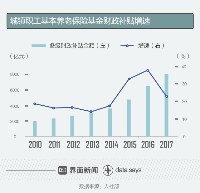 人社部数据显示,养老金财政补贴总额在近年快速增长,2017年超过8000亿元,增速达23%。