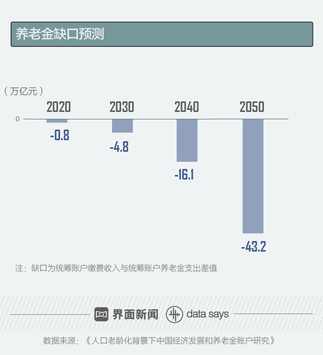 根据《人口老龄化背景下中国经济发展和养老金账户研究》,中国养老金缴费模型在基准情景下估算,若养老金体制不进行改革,财政补贴保持当前水平,2050年,国内养老金账户的累计缺口将达到43万亿。