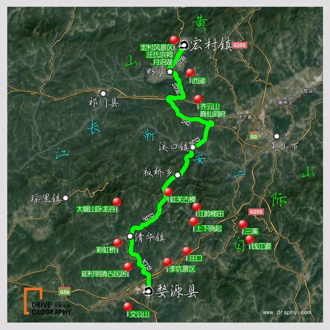 当天行程相对较为轻松,车辆从黟县(宏村/西递)出发,沿S218向南开行,过渔亭镇后开入匝道,过黟县收费站开上S42黄祁高速向东,随后在休宁收费站下高速,拐入X015一路向南,过溪口镇、板桥乡、浙源乡、清华镇,接X719过思口镇开往婺源。