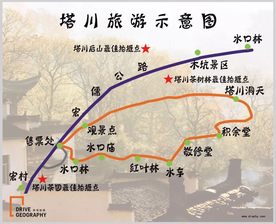 塔川村五个拍摄点1、村西边约200m路边,可拍塔川村落和横川村落,游人必打卡地,拍出来的作品也比较大众;2、村庄后边就是第二个拍摄点,需爬一段石阶山路,到观景台,可见塔川全景,空气通透的话,还可以拍到奇墅湖和宏村;3、第二个拍摄点往前150m左右就是第三个拍摄点,视野宽阔,可拍塔川、横川;4、从第三个拍摄点拐一个弯,路右边有高出公路的山丘,从前边上去是一片茶园(注意不要毁坏茶树),走几步就是第四个拍摄点,知道的人不多,可拍塔川、横川全景;5、从第四个拍摄点再往前,宏村隧道口,就是第五个拍摄点--协里风光拍摄点,远处就是奇墅湖。
