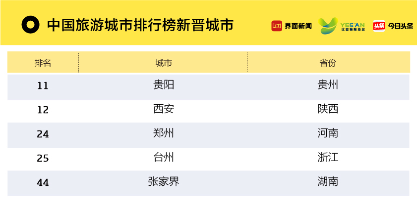 从今年排行榜的新成员来说,贵阳,西安,郑州,台州,张家界五个城市是旅游城市队伍中的新生力量,其中“避暑之都”贵阳排在第11名,有青岩古镇,黔灵山公园,花溪十里河滩等21个国家A级景区,旅游总收入达到2169亿元,占整个贵阳市GDP的53%,除此之外,贵阳周边也有不可错过的美景,例如距贵阳128公里的黄果树大瀑布,隶属安顺,是国家5A景区,明代旅行家徐霞客对其的描述为“珠帘钩不卷,匹练挂遥峰”。
