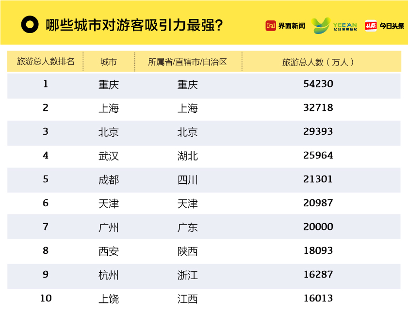 从旅游总人数来分析,山城重庆凭借近乎5.5亿数据量的旅游总人次远远甩开第二名的上海一个身位。我们注意到,重庆市辖区面积之大(8.42万平方千米),令人惊叹,约等于5个北京市(1.641万平方千米),13个上海市(0.634万平方千米),甚至接近于浙江全省的面积。此外,重庆的旅游资源本身也非常丰富,不仅有长江三峡,还有被列为世界自然遗产名录的武隆,主城区的渝中半岛摩天林立,两江交汇。所谓的“3D立体魔幻大都市”这两年更是刷爆网络,不少电影也都相继来重庆取景,还有众多的美食和美女。重庆在旅游方面的确炙手可热,荣登旅游人数榜单之首也是情理之中。