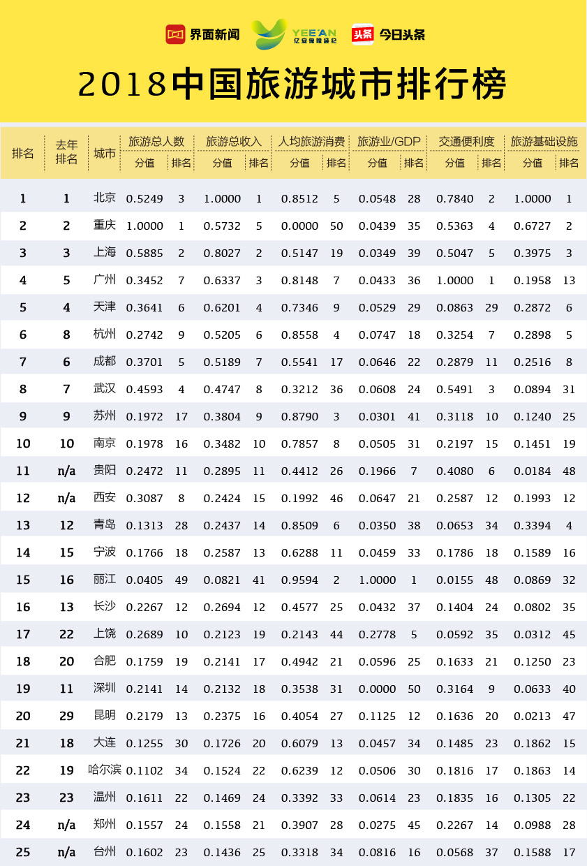 界面联合亿安保险经纪、今日头条共同发布2018中国旅游城市排行榜。这是界面第二次推出该榜单。为了体现最新的发展变化,我们更新了模型和算法。