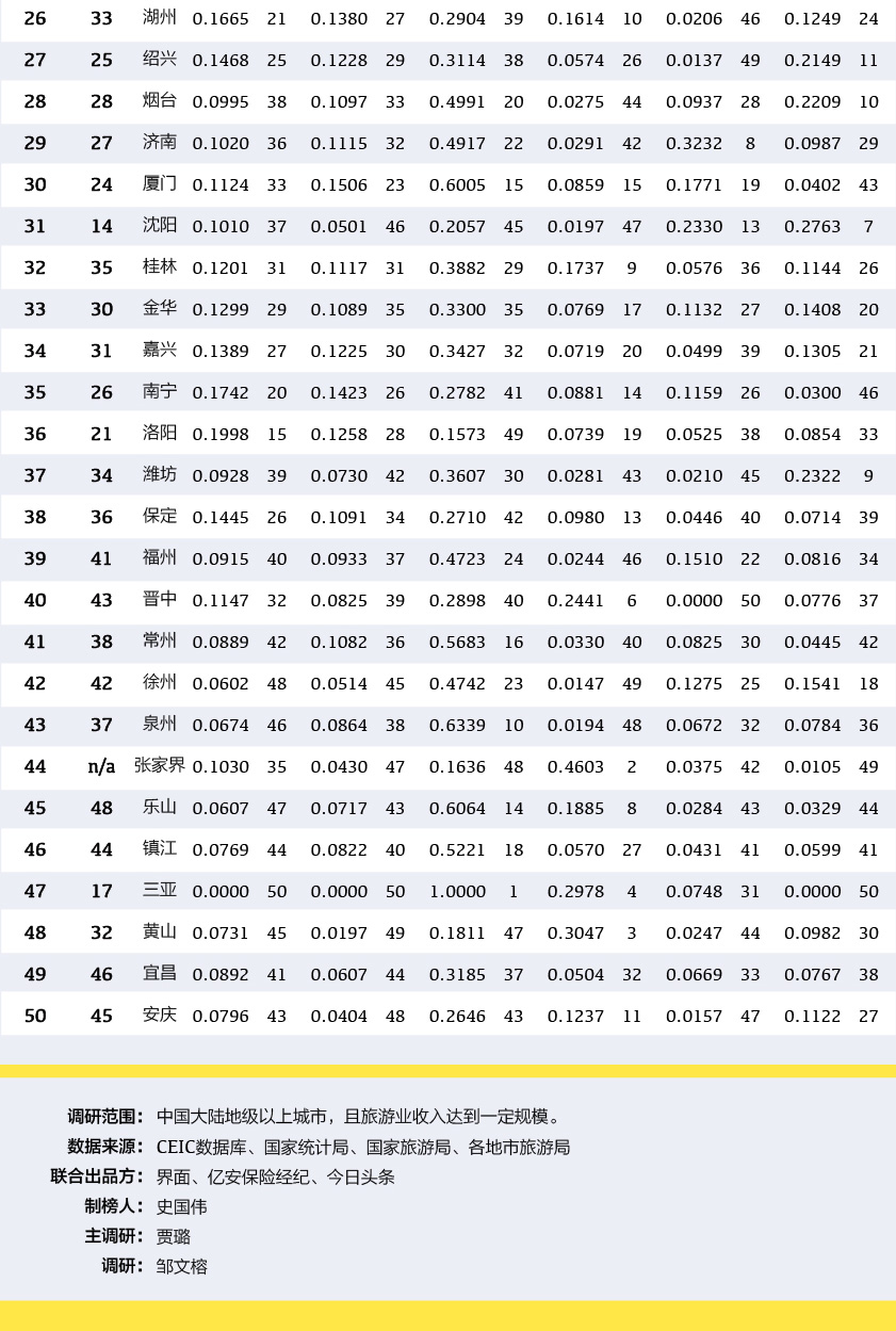 界面根据地级以上城市的旅游人数、旅游收入、人均旅游消费、旅游业比重、交通便利程度和旅游基础设施六个维度来进行评比,进而计算出中国旅游城市的排名,选出前50名进行展示。数据主要源自CEIC数据库,国家统计局,国家旅游局以及各地市国民经济和社会发展统计公报。
