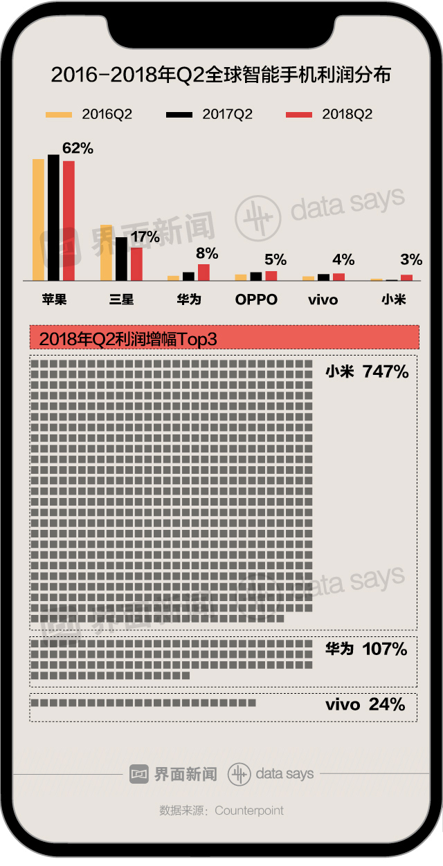 从利润增幅来看,小米为2018年第二季度利润增幅最大的手机品牌,增幅达747%。紧随其后的是华为和vivo,分别为107%和24%。