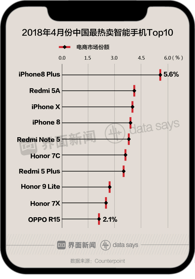 具体到中国市场,2018年4月,苹果和小米包揽中国地区最热卖智能手机榜单前五。其中,iPhone8 Plus为中国地区最热卖智能手机,电商市场份额为5.6%。其次是红米5A和iPhone X,电商市场份额分别为4.1%和4.0%。