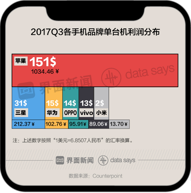 Counterpoint数据显示,苹果手机单台利润为151美元。与其相比,中国手机厂商平均每部手机利润约为其1/14。