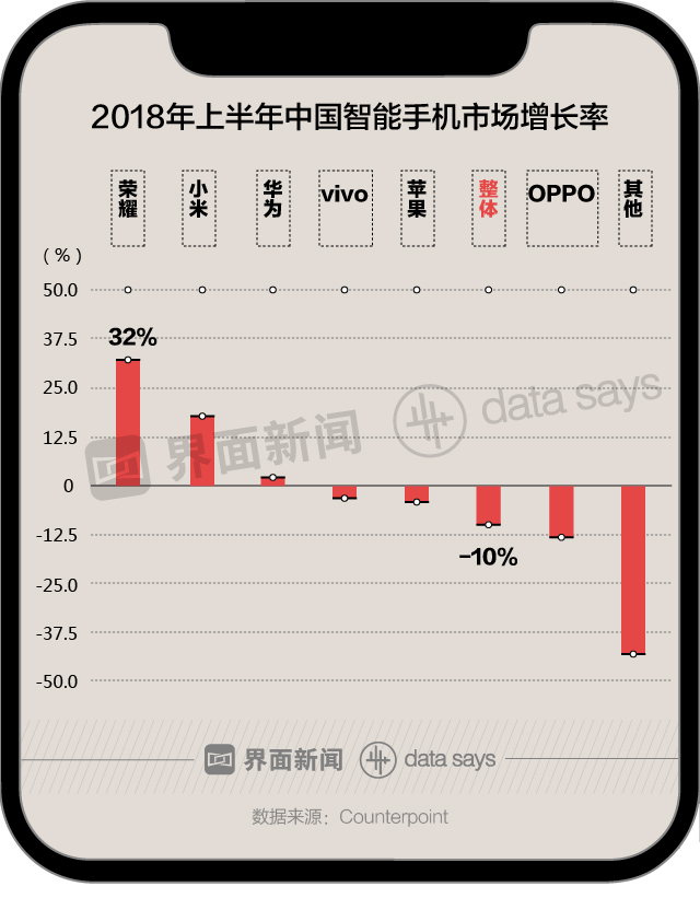 除此之外,2018年上半年荣耀异军突起,在中国智能机市场表现突出。其市场增长率达32%,远超其他品牌。