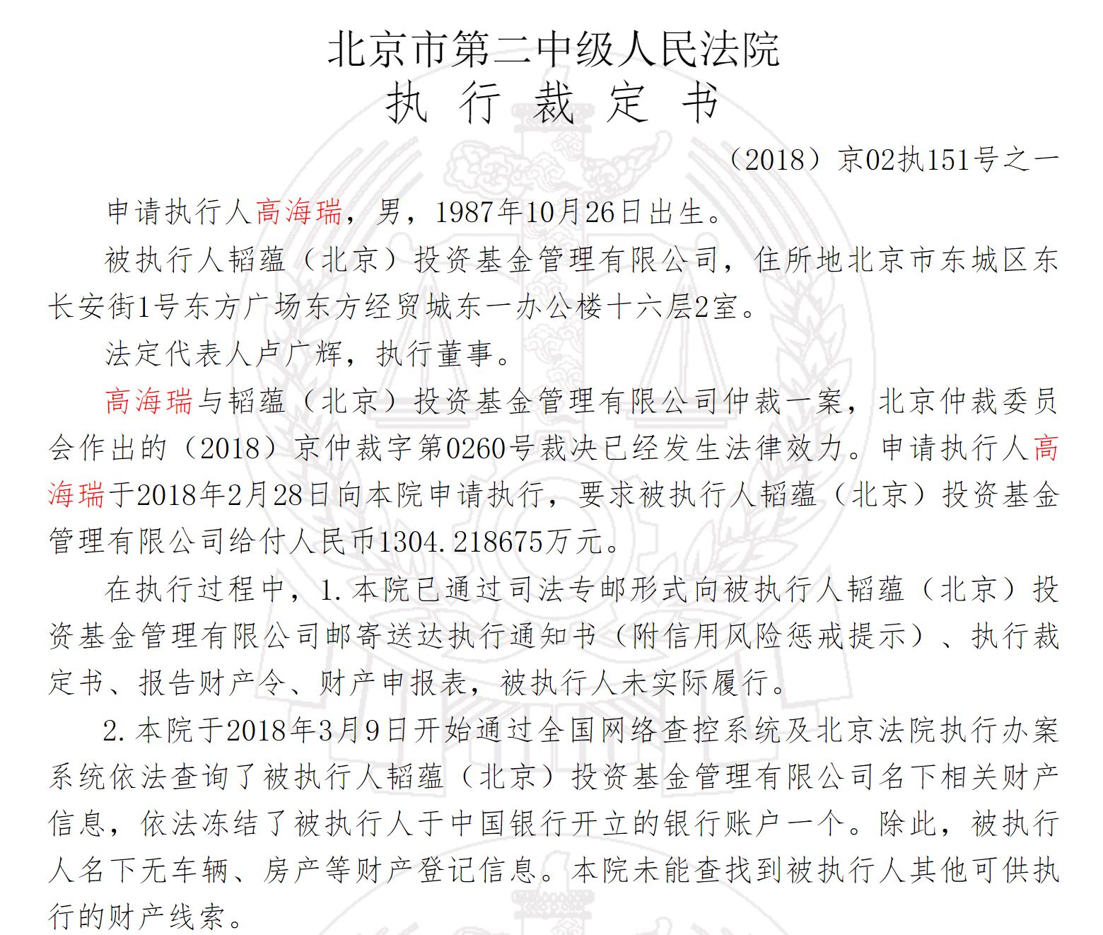 接近司法部门的人士向界面新闻记者确认,目前,韬蕴投资未履行执行。在9月17日被北京市第二中级人民法院调查、查封的当日下午,仅缴纳小额罚款。目前,投资人高先生已向北京市东城区人民法院提交韬蕴投资的破产申请。