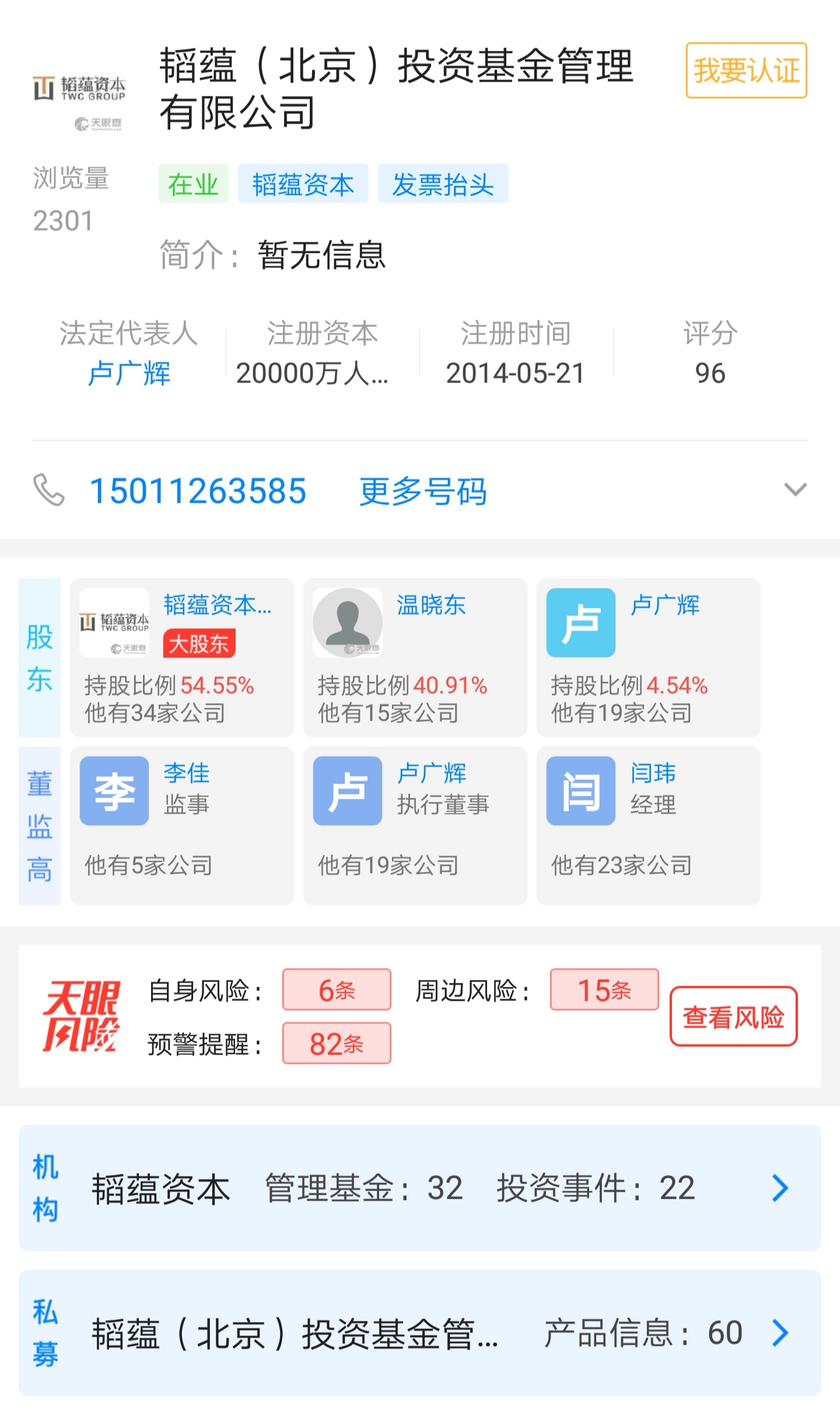 韬蕴投资成立于2014年5月21日,法定代表人卢广辉,80后神秘富豪温晓东的韬蕴资本为其大股东,温本人亦是韬蕴投资的股东之一。