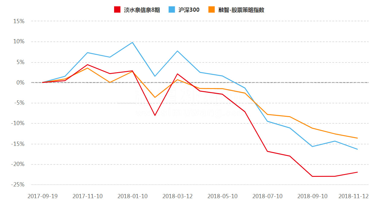 其中典型的如“淡水泉信泉8期”,从净值走势上看,该产品自去年9月19日成立以来便长期跑输同期沪深300指数以及融智股票策略指数,今年3月中旬至今,其净值更是一路下挫,截至11月12日,该产品的最新净值仅为0.7801,成立未满15个月,累计亏损已经高达21.99%。