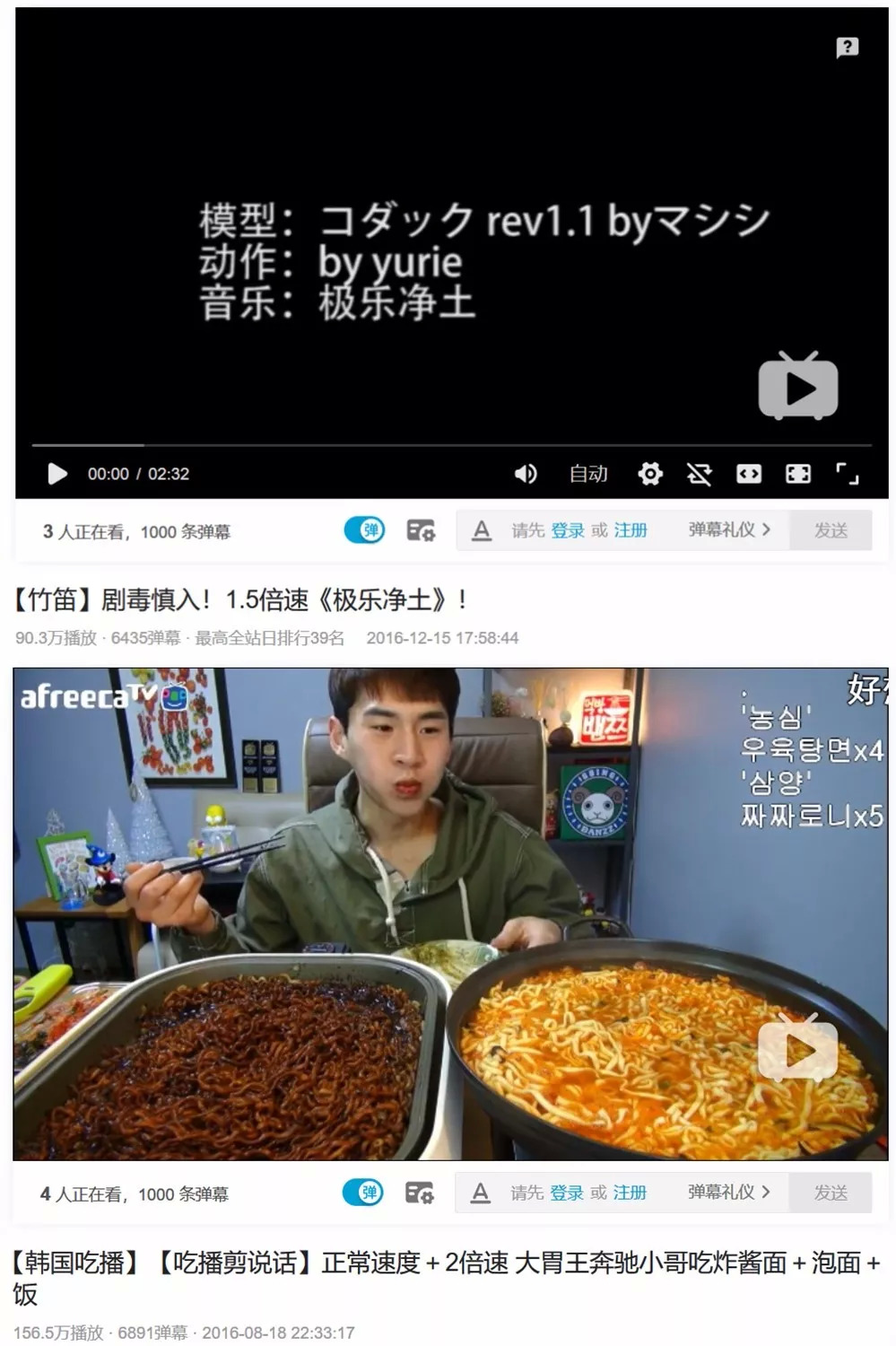 B站是最早开设鬼畜区的视频网站,还时不时会有1.5倍速播放专区,“配合X倍速播放效果更佳”的句子也是深入人心。还有不少UP主热衷制作倍速视频,这种便是以冲突达到鬼畜喜感为主要效果了,比如5倍速吃炸鸡,1.3倍速吹扬琴等内容。