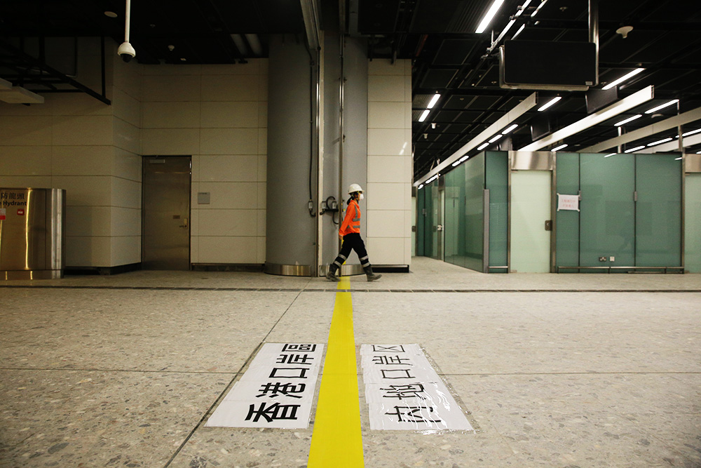2018年3月23日,在香港至广州的高铁西九龙总站,一名工人走过分隔香港(L)和中国大陆控制区的一条分界线,这条线是联合入境检查站的一部分。从海滨西九龙站(harbourfront West Kowloon station)出发的这条高速铁路将于2018年开通,将香港与80英里(130公里)以外的广州连接起来,然后连接到中国国家铁路网。