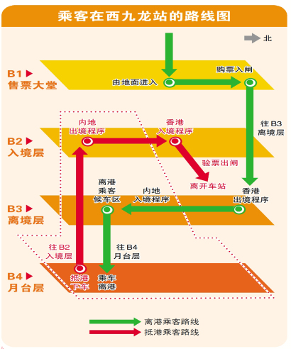 根据全国人大常委会批准的《内地与香港特别行政区关于在广深港高铁西九龙站设立口岸实施“一地两检”的合作安排》,旅客在香港西九龙车站采用“一地两检”方式办理出入境,过关时间可大大节省。内地赴港旅客在B4月台层下车,前往B2入境层办理内地出境程序,然后离开内地口岸区,进入同一层的香港口岸区办理香港入境程序。