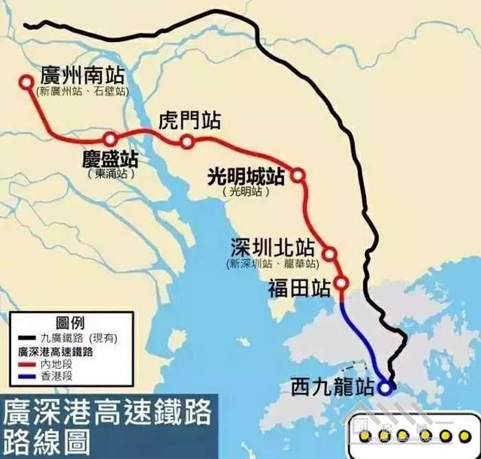 广深港客运专线从香港出发设置了6个站点——福田、深圳北、光明城、虎门、庆盛、广州南,至深圳福田站最短运行时间为14分钟,至深圳北站最短运行时间为18分钟,至广州南站的最短运行时间为47分钟。