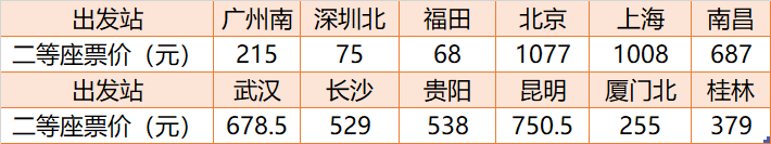 从广州前往香港的高铁二等座票价为215元人民币,深圳北至香港的二等座票价为75元,北京和上海至香港分别需要1077和1008元。