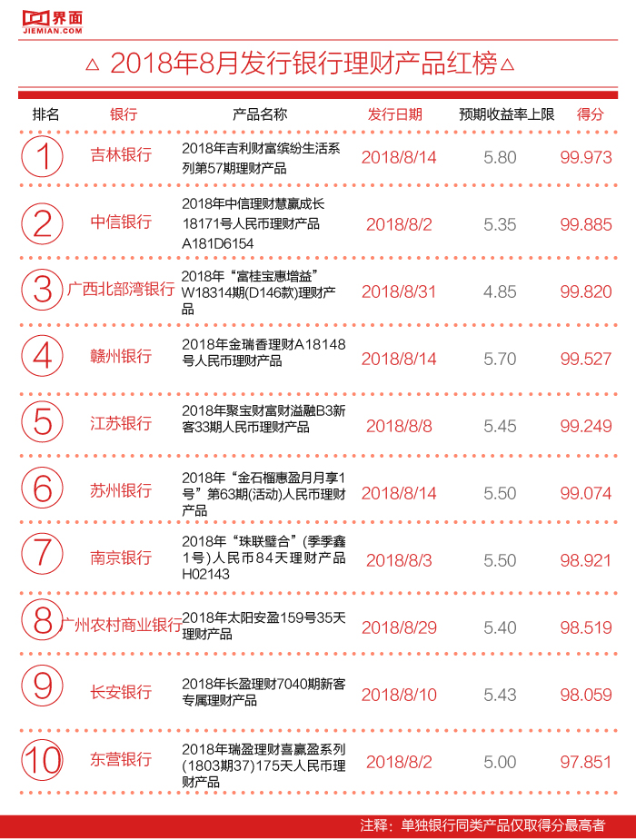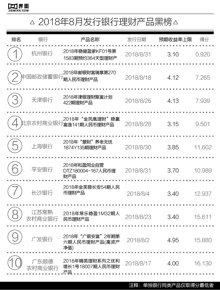每个月,界面新闻会根据自己制作的一个涵盖数万只理财产品的数据库,对当月理财产品进行评估与排行。该数据库在衡量当期宏观经济、行业水平、银行自身风险、产品属性后选出性价比最高和最低的产品,其挑选范围是全行发售的信息披露充分的非结构类理财产品,最终形成当月产品红黑榜。