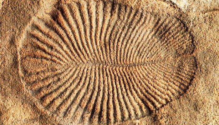 这批化石形成于约5亿7500万年前至5亿4100万年前,这一时期被称为埃迪卡拉纪(The Ediacaran Period)。这些化石中包含的是地球上已知最古老的复杂生物,这些生物既非微小的单细胞有机体,也不是由单细胞微生物构成的简单多细胞集群。不管从地球的演化史还是生物的进化史来看,这些化石形成的时代离我们所处的时代都太过遥远了。相比壳和骨骼,肉体很难形成化石,因此我们对这些生物的真实情况几乎一无所知。1947年,澳大利亚的科学家首次发现了存在于埃迪卡拉纪的狄更逊水母的化石。这种生物是一种节肢动物,长度可达1米,形状如煎饼,科学家们认为这种奇特的有机体或许是一种早期的水母。不过,从化石来看,狄更逊水母和埃迪卡拉纪的其他生物并不具有与今天的任何动物相似的特征,比如口或内脏。因此,它们在生物树上的位置一直存在争议:如果它们不是水母,那么它们可能是类似蠕虫的环节动物、某种蘑菇、巨大的地衣抑或单细胞有机体。
