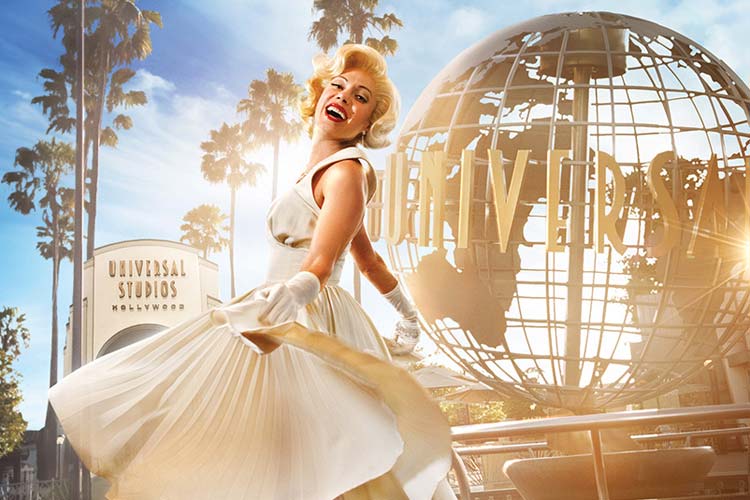 从停车场出来先穿过影城外的商业街,沿街鳞次栉比密布着各色商店,饭店,咖啡店,不少门店装修布置成戏剧化的布景风格,许多熟知已久的电影元素点缀其间。街道上除了密密匝匝的游人,不时有人即兴表演助兴节目,或者突然冒出一个扮成小丑的角色,主动和行人打招呼合影,为艳丽喜庆颇具50年代西部小镇风情的街道平添了更多乐趣,浓郁的好莱坞气息已扑面而来。影城白色镶金的大理石拱门外铺着红地毯,门楣上镶嵌着金光灿灿由大写字母拼写而成的UNIVERSAL STUDIOS,好像是在向游客招手,欢迎来到世界上最著名的造梦工厂,热火朝天的好莱坞寻梦之旅就此拉开序幕。