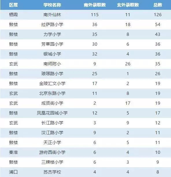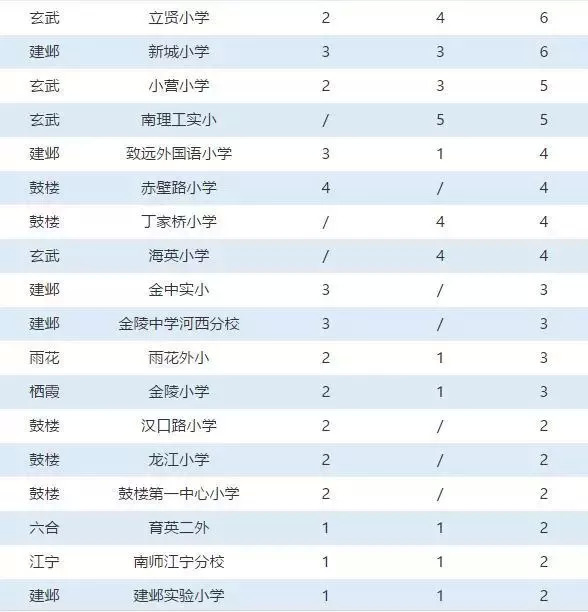 从这份榜单中可以看出,抛开仙林外校这个BUG外,鼓楼区仍然占据着教育成绩的头把交椅。拉小、力小、芳小、银城名列前茅,但琅琊路小学的数据并不是特别突出,取而代之的是南师附小,北京东路小学、成贤街小学,这些南外成绩不是特别突出的,由于玄外的录取人数不少,都挤进TOP10。