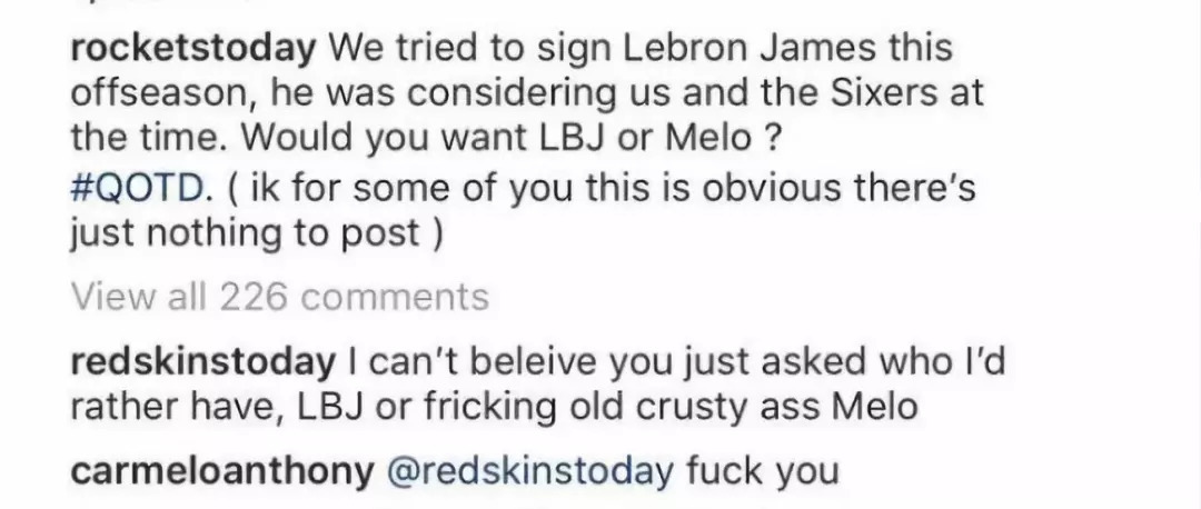 在他加盟火箭以后,一个火箭球迷账号竟然让球迷们做选择:我们追过LBJ!结果甜瓜来了,你更想谁来呢?还暗戳戳的做出了答案显而易见的备注。更过分的是,华盛顿红皮队在底下回复,你竟然问这种蠢问题?