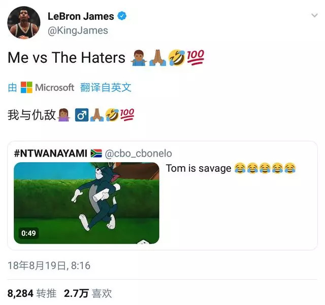 詹姆斯先是带队取得一波连胜,然后在Twitter转发了动画片猫和老鼠中,汤姆轻松玩弄斯派克的经典片段并配文:我VS黑子们,哈哈哈!