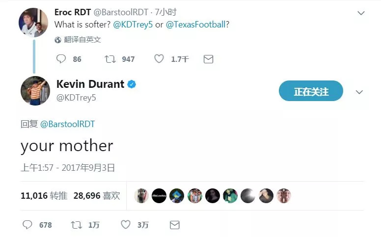不过,在经历过小号风波、网络骂战等一系列事件以后,杜兰特似乎变得温和了。他不在粗暴结束与球迷的“对手戏”,而是晓之以理动之以情地辩论。这是他对黑粉特有的温柔。