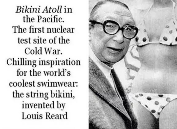 1946年,法国设计师路易斯·里尔德(Louis Réard)通过三块布和四条带子设计出了一款泳装。那一年原子弹试爆点在美国太平洋上的比基尼岛,设计师为了蹭热点,希望这个发明能像原子弹爆炸那样引爆20世纪潮流,他将自己发明的泳衣命名为“比基尼”。这里还有一个小秘密,事实上比基尼早在1940年就设计完成了,6年后才得以公布于天下。