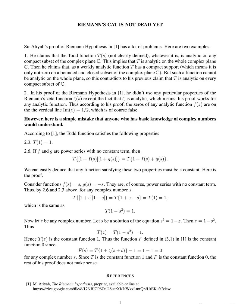 而对于Todd函数引用的严谨程度,更有人写上一页的论文来回“怼”。如图,在分析中,作者给出了两点疑惑:一是作者根据阿蒂亚给出的公式分析出Todd函数不是在全平面可解析的,这与老爷子给出的前提矛盾;第二,作者指出阿蒂亚并未严谨的给出他在采用zeta函数时的限定条件,因此其中存在一定的矛盾。