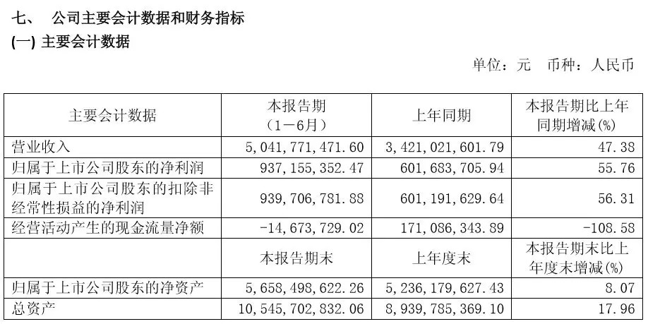 归属于上市公司股东净利润约为9.37亿元,相较于上年同期的6.02亿元,涨幅为55.76%,营收与净利均继续保持稳定增长势头。