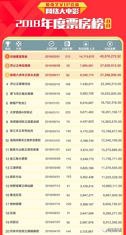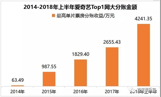 爱奇艺是网大行业的先行者,其网大的分账成绩基本被业界当做网大行业的风向。其中,2014年,白举纲、于朦胧等人主演的《成人学院2》以63.4万的票房分账成为爱奇艺分账冠军;2015年的《山炮进城》、2016年的《山炮进城2》分别以987.55万、1829.4万获得票房分账冠军;2017年,《斗战胜佛》用2655.43万再次刷新票房分账记录。而2018年上半年,网大票房分账天花板便突破4000万。