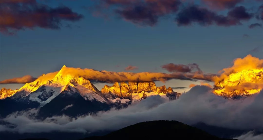 “云南第一峰”位于德钦县城升平镇西,名叫卡格博峰,海拔6740米。梅里、太子雪山南接碧罗雪山,北连西藏阿冬格尼山,气势磅礴,无比壮观。那傲然挺立于十三峰之上的卡格博峰,高耸入云,横亘天际,是享誉中外的奇峰。