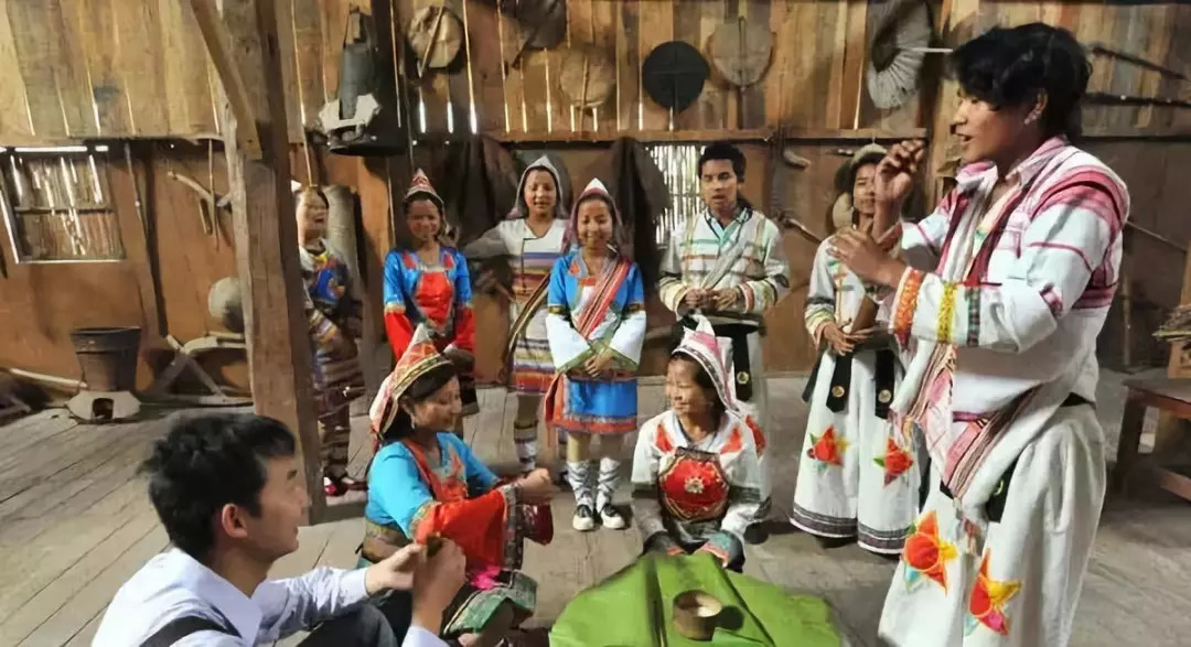 基诺族很重视成人礼,女孩子到了十五岁那天,她的围裙就换成夹层的,发式也要改变成一条独辫,这样才可以背筒帕(挂包)。