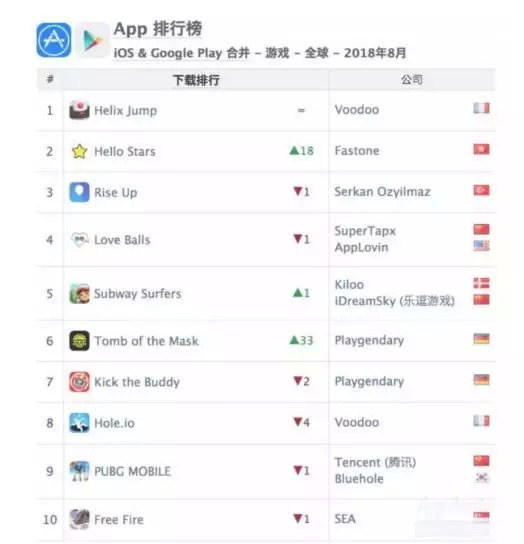2018年8月全球游戏下载榜单,8款超休闲游戏上榜
