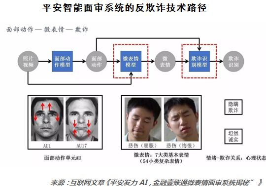 比较常见的金融欺诈情形包括主体不实和信息不实,前者可以通过人脸识别、指纹识别等生物体证识别类的AI技术解决,后者则是通过面审解决,传统人工面审对面审人员的经验和能力要求极高,而情感AI技术就是要替代这些技艺高超的面审人员,将其面审流程标准化和审核结果数量化。