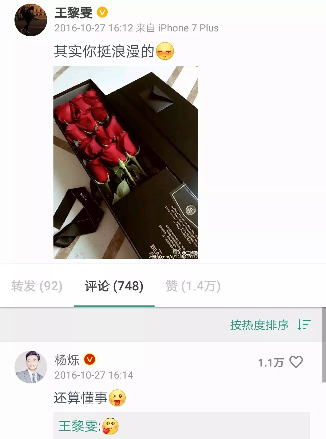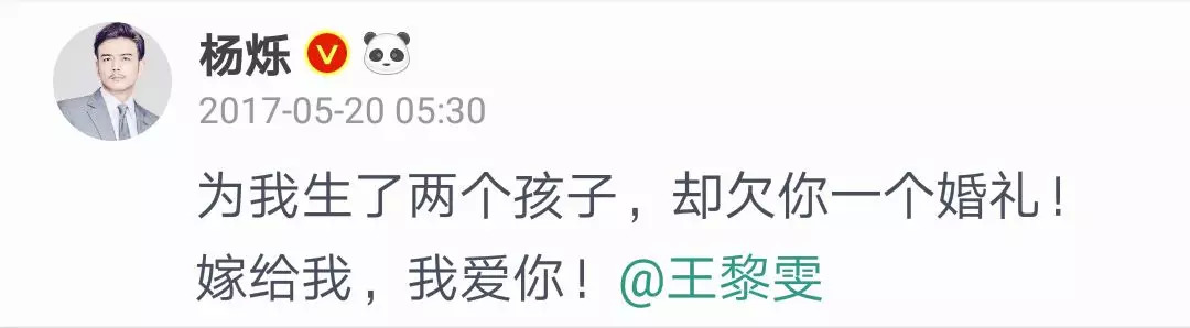 杨烁一直记得亏欠的婚礼,于是在去年5月20日,这样一个十分有爱的日子,他在微博上高调示爱:“为我生了两个孩子,却欠你一个婚礼!嫁给我,我爱你!”向围观群众撒了一大波狗粮~