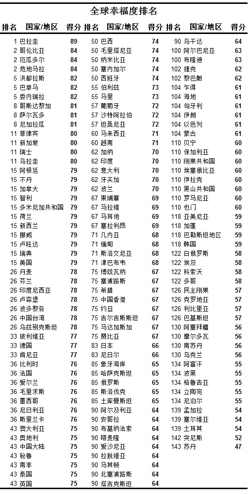 根据世界银行统计汇编的2013年数据,按购买力平价计算,人均国民收入排名全球第135位的巴拉圭,其国民却拥有最多的幸福;排名第138位的危地马拉,也在人民幸福度排名中名列全球第二。