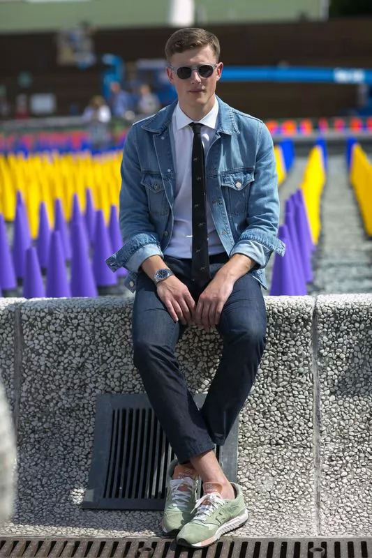 同样的牛仔外套配衬衫,也可以系领带穿,会给人正式又幽默风趣的感觉。