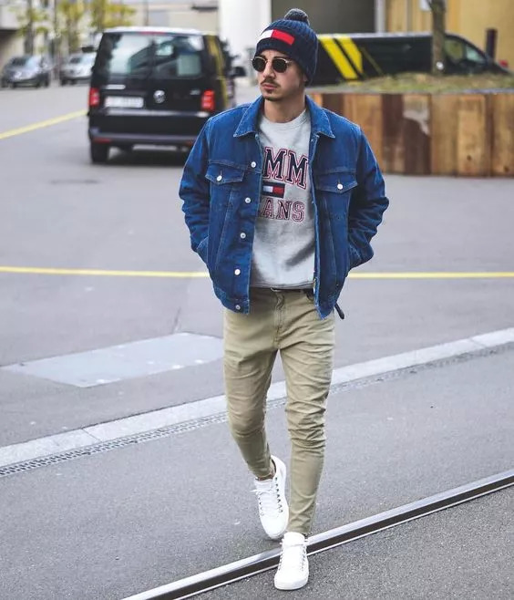 还有就是可以选择运动风的休闲裤与牛仔外套搭配。