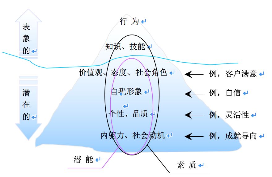 能力一词,是由competency翻译过来的。就个体而言,我们在某些专业书籍中所看到的几个不同的概念,比如胜任力、素质、潜质、能力都是由这个单词所翻译过来的。作为能够驱动个体绩效实现的投入,个体能力往往是一个相对全面的概念。包括了冰山以上的知识和技能,也包括了冰山以下的社会角色、价值观、动机、品质等潜质。