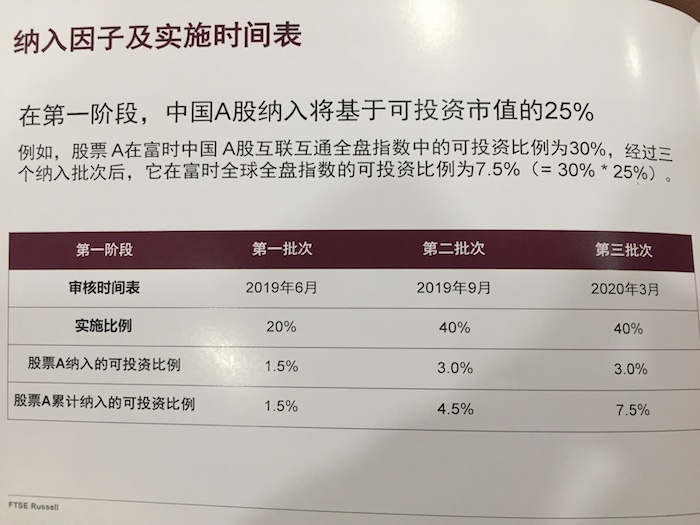 据了解,富时罗素将于2019年6月开始将中国A股纳入富时全球股票指数系列,具体实施将分三步进行,直至2020年3月。在每一个纳入批次完成后,富时罗素会寻求市场反馈以评估市场吸收新增资产的能力。股票纳入将按富时中国A股互联互通全盘指数(目前约1250个成分股)中合资格的大、中、小盘股票可投资市值的25%计算。在纳入完成的第一阶段完成后,预计A股在富时新兴市场指数中的权重为5.5%,在富时环球指数中的权重为0.6%。