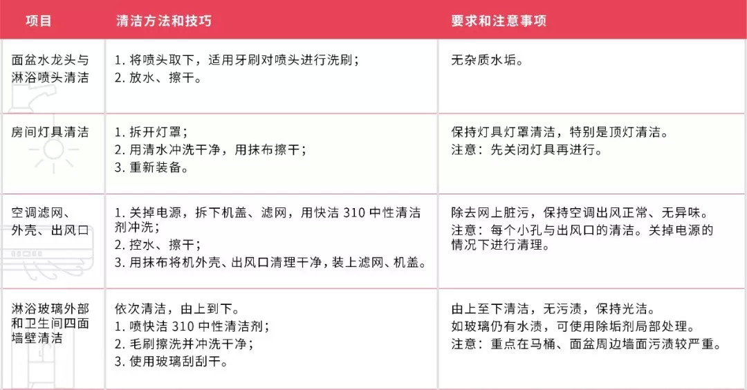 保洁阿姨需要完成45个日常保洁和18个深度保洁项目。以清洁马桶为例,保洁阿姨需要完成四个步骤:包含导入洁厕剂、用百洁布粘清洁剂将马桶溢水口擦白、清洁马桶内壁、清洁马桶下水弯道处。